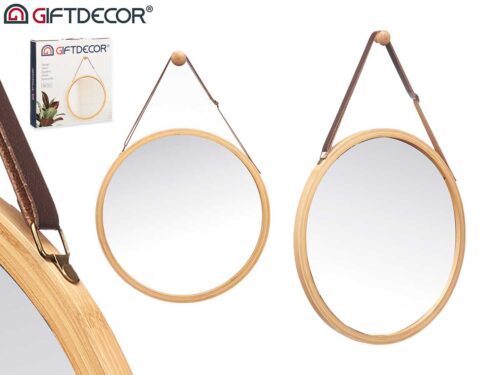 Espelho bambu redondo 38cm asa em couro